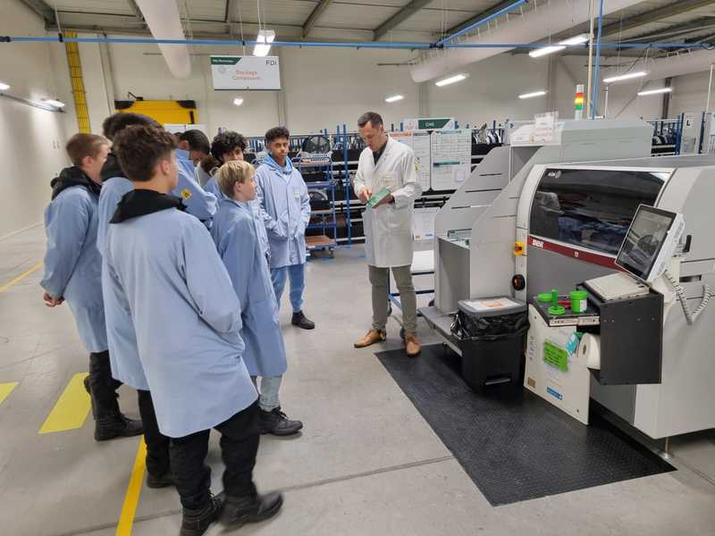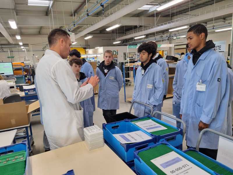– Puis nous avons observé la ligne de production qui permet de mettre les composants automatiquement et rapidement sur les cartes électroniques. Ce sont des Composants Montés en Surface (CMS), au préalable la carte est recouverte de pâte à souder grâce à un pochoir puis elle passera au four à 260 °C.